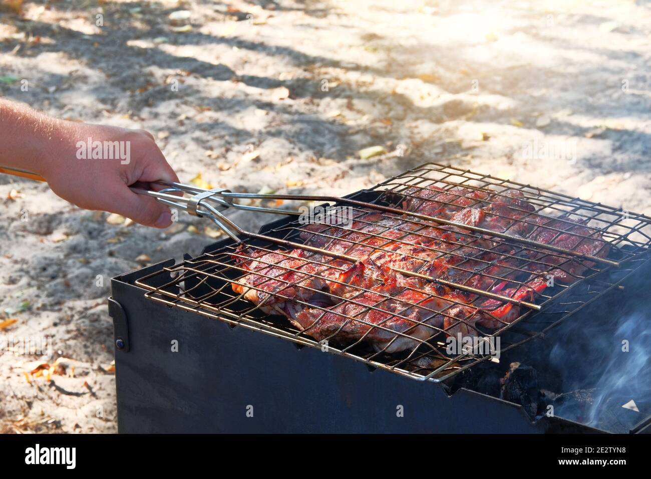 Fried Pieces Of Meat In Lattice Are Roasted On Grill At Festival Outdoor Cooking Meat On Barbecue Stock Photo Alamy